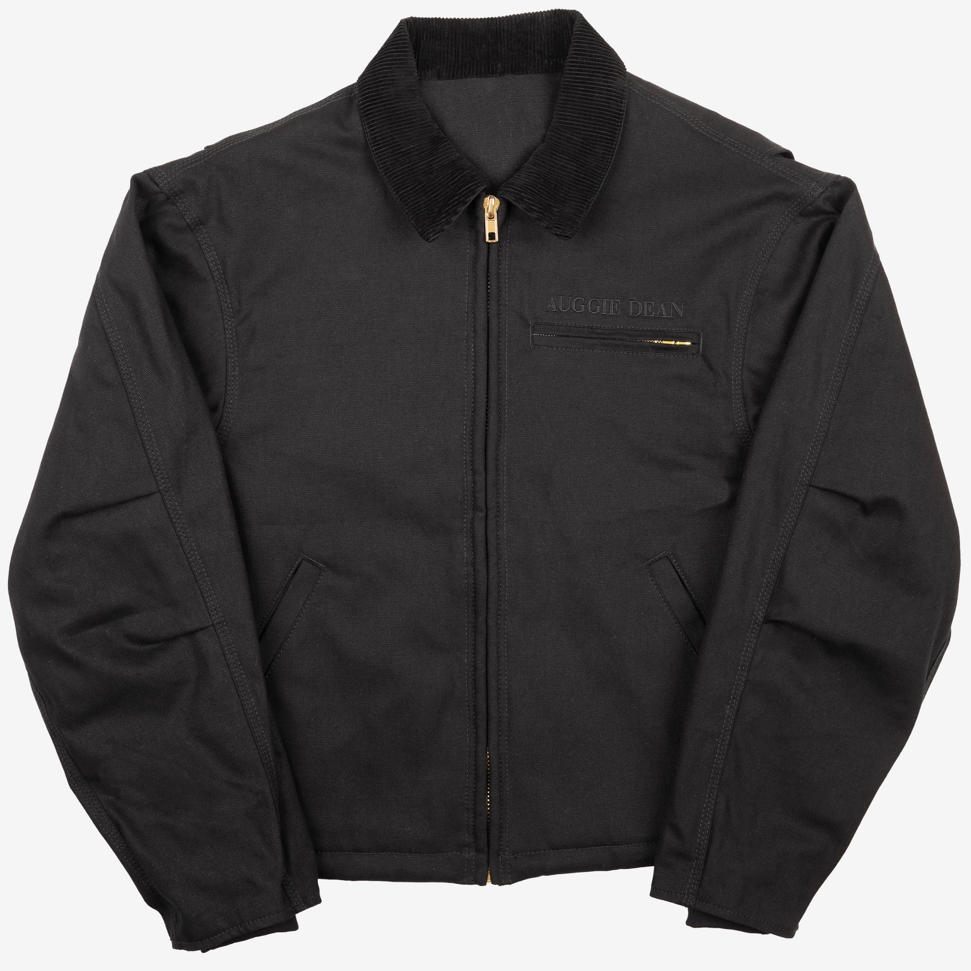A casual rebelliousness championed by the rugged ‘everyday look’ of American workwear, this jacket brings an elevated, refreshed haute couture aesthetic to the iconic canvas uniform look. A ribbed corduroy collar softly accents the firm canvas shell that is decorated with chic brass hardware. Slanted welt pockets adorn the front, while soft stormcuff ribbing has been carefully stitched inside of each sleeve. All of this is anchored by the plush luxuriousness of a jacket lined with soft baby fleece fabric. The result is the enduring cool of a classic uniform that is easy to mix and match in an emerging wardrobe.